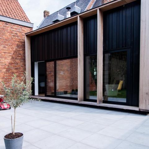 De typisch oude "koterijen" van deze bakkers woning werden gesloopt om een nieuw hedendaags volume te plaatsen. De gevel bestaat bijna uitsluitend uit glas. Om oververhitting te voorkomen werd de structuur buiten het beschermd volume geplaatst zodat er met luifels kon worden gewerkt. Alles werd afgewerkt met een leuk lijnen spel in de thermowood vuren houten gevelbekleding.